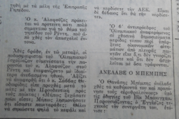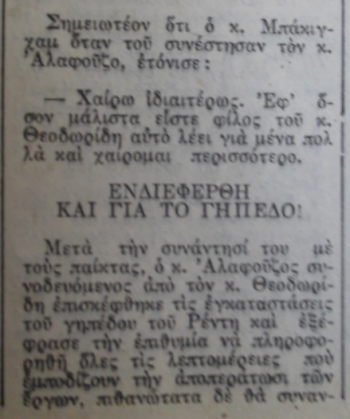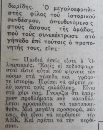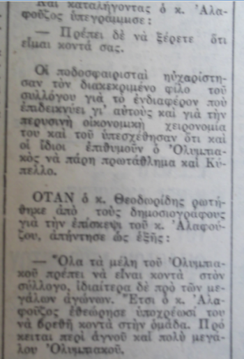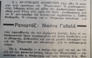 Νοέμβριος του 1975 και ο Ολυμπιακός υποδέχεται την ΑΕΚ στο Καραισκάκη, στα πλαίσια της 4ης αγωνιστικής του πρωταθλήματος της σεζόν 1975-76. Το ματς είναι κρίσιμο, κυρίως επειδή ο Θρύλος ταλανίζεται από σοβαρά διοικητικά προβλήματα. Εκείνη την στιγμή, κάνει και πάλι την εμφάνισή του ο Αριστείδης Αλαφούζος, για να εμψυχώσει τους παίκτες μας. Επισκέπτεται το προπονητήριο του Ρέντη, μαζί με το ''φανατικό γαύρο'' γιο του.